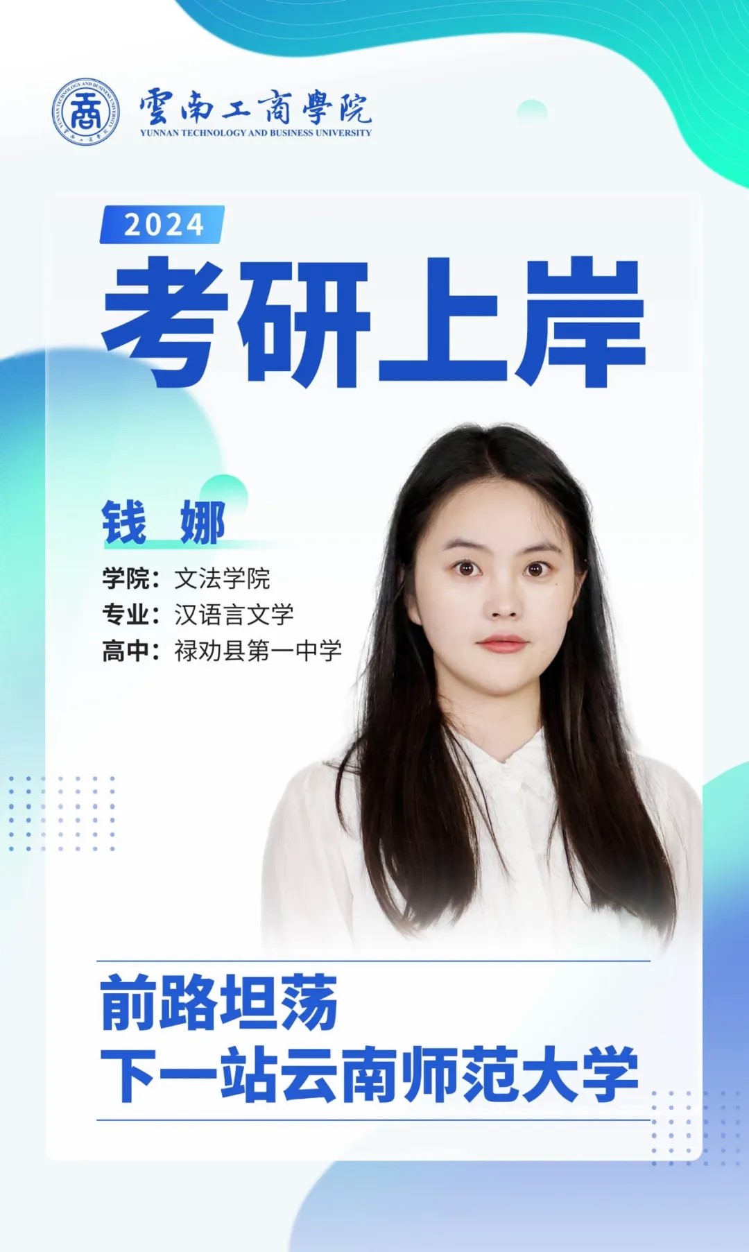 大家好,我是钱娜。高中毕业于禄劝县第一中学,今年考研顺利上岸云南师范大学。大学期间曾连续两年获得国家励志奖学金,还获得过云南省优秀毕业生、校级优秀共青团员、校级优秀班干部、院级优秀实习生等称号。2021年参加中国语言文字能力大赛并获得优秀志愿者称号。