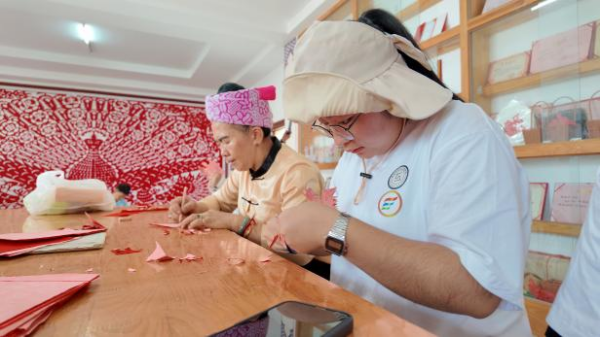 剪纸不仅仅是技艺的展现,更是情感的寄托和文化的传承。在户么村手艺人指导下,实践团成员们认真学习如何握剪、如何构思、如何下剪。“咔嚓、咔嚓……”随着剪刀在红纸上的灵活游走,一幅幅精美的剪纸作品逐渐展现在大家眼前。