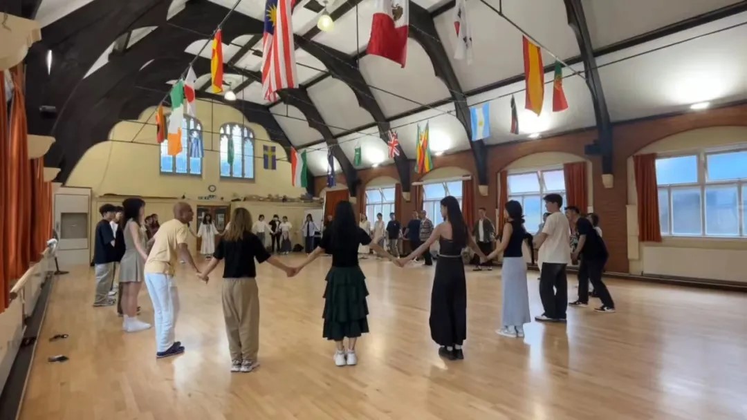 此次研学之旅,同学们除了走进课堂学习名校课程之外,也体验了生动多样的英伦文化。随着第一天课程的圆满结束,一场精心策划的破冰莎莎舞会拉开序幕。在授课老师的带领下,同学们开始学习独特的舞步,伴随着欢快的音乐,大家逐渐被灵动的舞蹈带动,在现场趣味的互动活动和热烈的氛围中,初见的尴尬逐渐缓解,此次在剑桥同窗的友谊悄然建立。