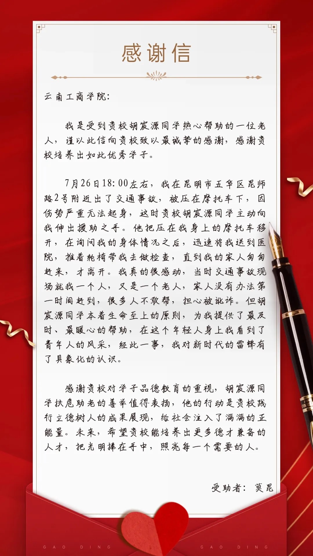 7月26日下午18点左右,昆师路附近一辆小汽车和一辆摩托车发生交通事故,骑摩托车的老人被压在摩托车下无法动弹,小汽车司机和周围人出于各种顾虑没有上前帮忙,情况很危急。此时,胡宸源同学正好路过,他冲出人群立即把压在老人身上的摩托车移到路边,扶老人到公交站台座椅上休息,帮老人手部和腿部出血的伤口止了血,在听老人说脚部和胸部非常疼之后,决定送老人到医院检查,又联系了他的家人。在医院里他推着轮椅带老人做检查治疗,陪护了三个多小时,直到老人的家人来到医院。期间,老人及其家人多次表示要给他酬金和请他吃饭感谢他,胡宸源同学并没有接受,只说了“扶危助困,人人有责,不必客气”便离开了。事后,老人了解到胡宸源同学是taptap点点官方网站的学生,便给学校送了感谢信和锦旗。