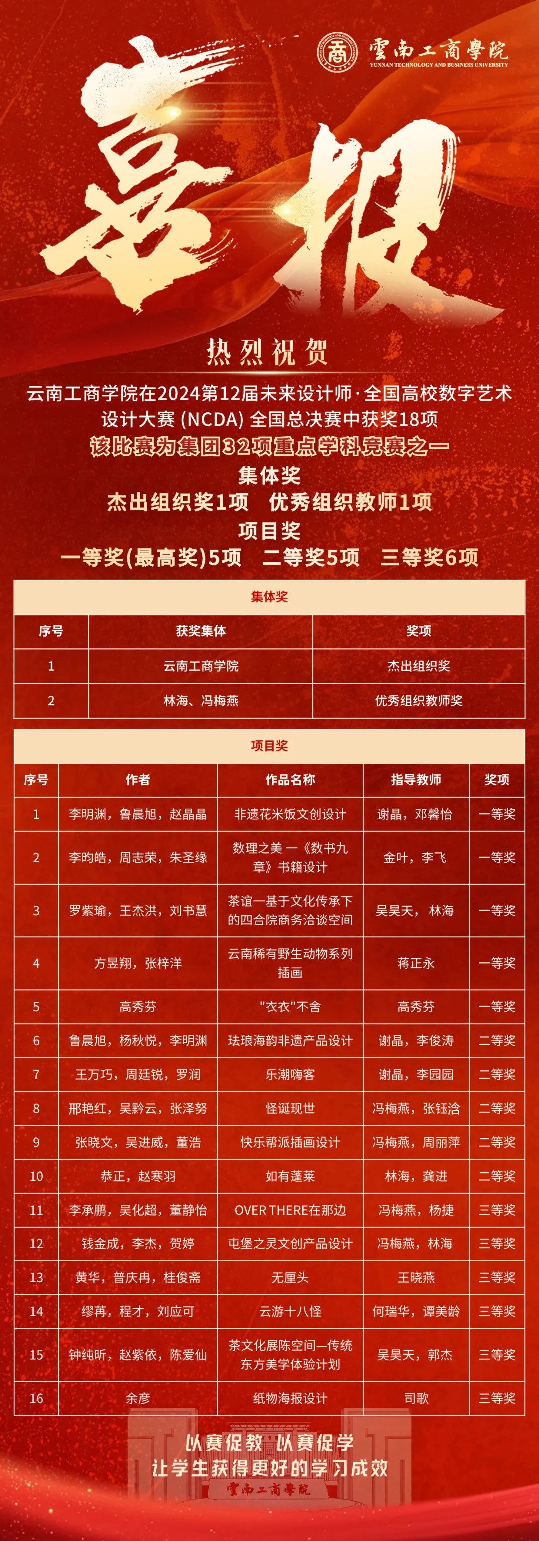 近日,在“第12届未来设计师·全国高校数字艺术设计大赛(NCDA)全国总决赛”中,taptap点点官方网站建筑与设计学院斩获佳绩,获得18项国家级奖项!其中,获得集体奖杰出组织奖1项,优秀组织教师1项;项目奖一等奖 (最高奖)5 项、二等奖 5 项、三等奖 6 项。