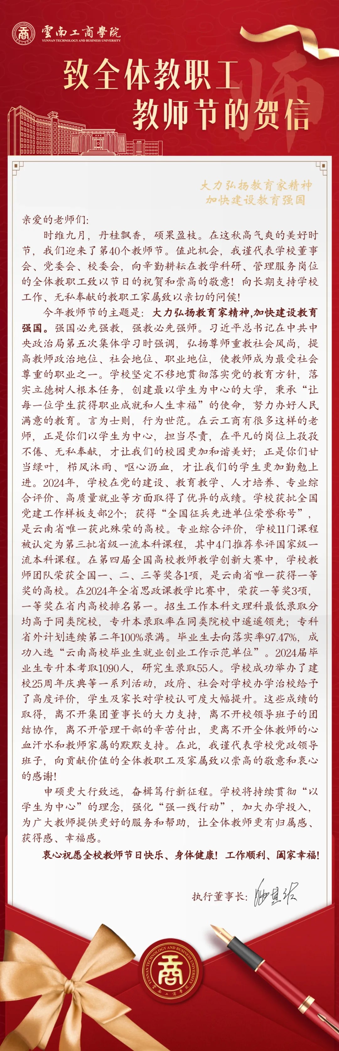 执行董事长姬其佐向全体教职工致以节日的祝贺和崇高的敬意,并强调学校将为广大教师提供更好的服务和帮助,让全体教师更有归属感、获得感、幸福感。