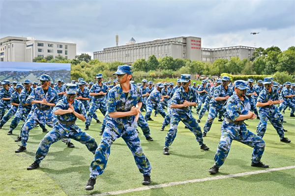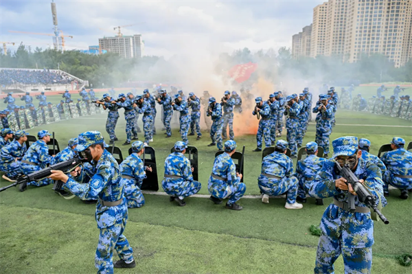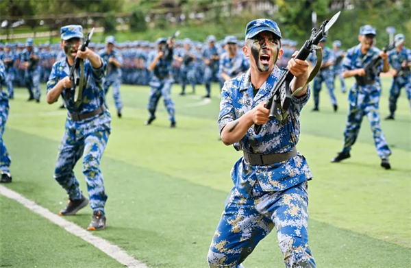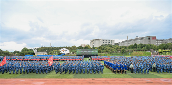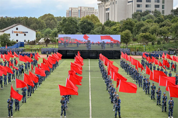 典礼在庄严的国歌声中拉开帷幕。分列式开始,2024级新生以9个营64个连,7个分列式方阵整齐列队。他们迈着整齐划一的步伐,喊着高昂响亮的口号,自信果敢、英姿勃发,有序通过主席台接受检阅,21天的磨炼在此刻交上优异的答卷。