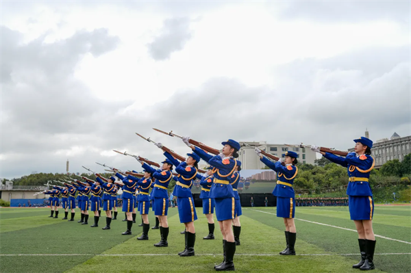 踏步、转身、出枪,排面整齐、动作有力,枪起枪落间充满力量与美感,她们用阳光和朝气书写着青春,尽显巾帼不让须眉之风采。
