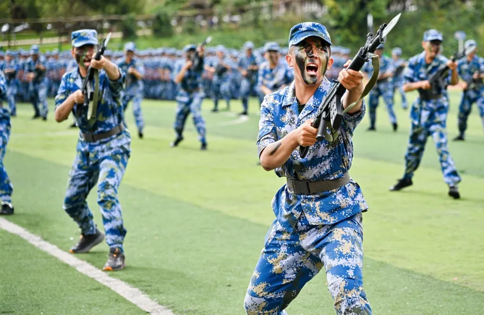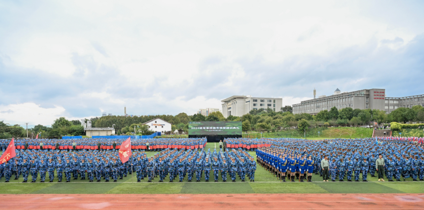 活动在庄严的国歌声中拉开帷幕。分列式开始,党旗、国旗、团旗、校旗引领前进的方向,2024级新生以9个营64个连,7个分列式方阵整齐列队。他们迈着整齐划一的步伐,喊着高昂响亮的口号,自信果敢、英姿勃发,有序通过主席台接受检阅,21天的磨练在此刻交上优异的答卷。