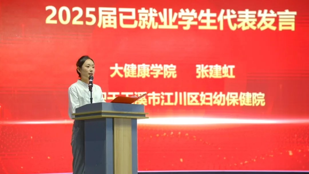 25届毕业生张建虹目前已入职玉溪市江川区妇幼保健院妇产科,活动现场,她结合当前就业形势和自身情况,从就业信息获取、简历投递、求职技巧等方面细致生动地分享了成功就业的经验,鼓励在场的毕业生:“希望大家在为梦想而奋斗的过程中,始终坚守初心、从‘小我’融入‘大我’,燃起奋斗的激情,继续追寻心中所爱,成就人生梦想。”