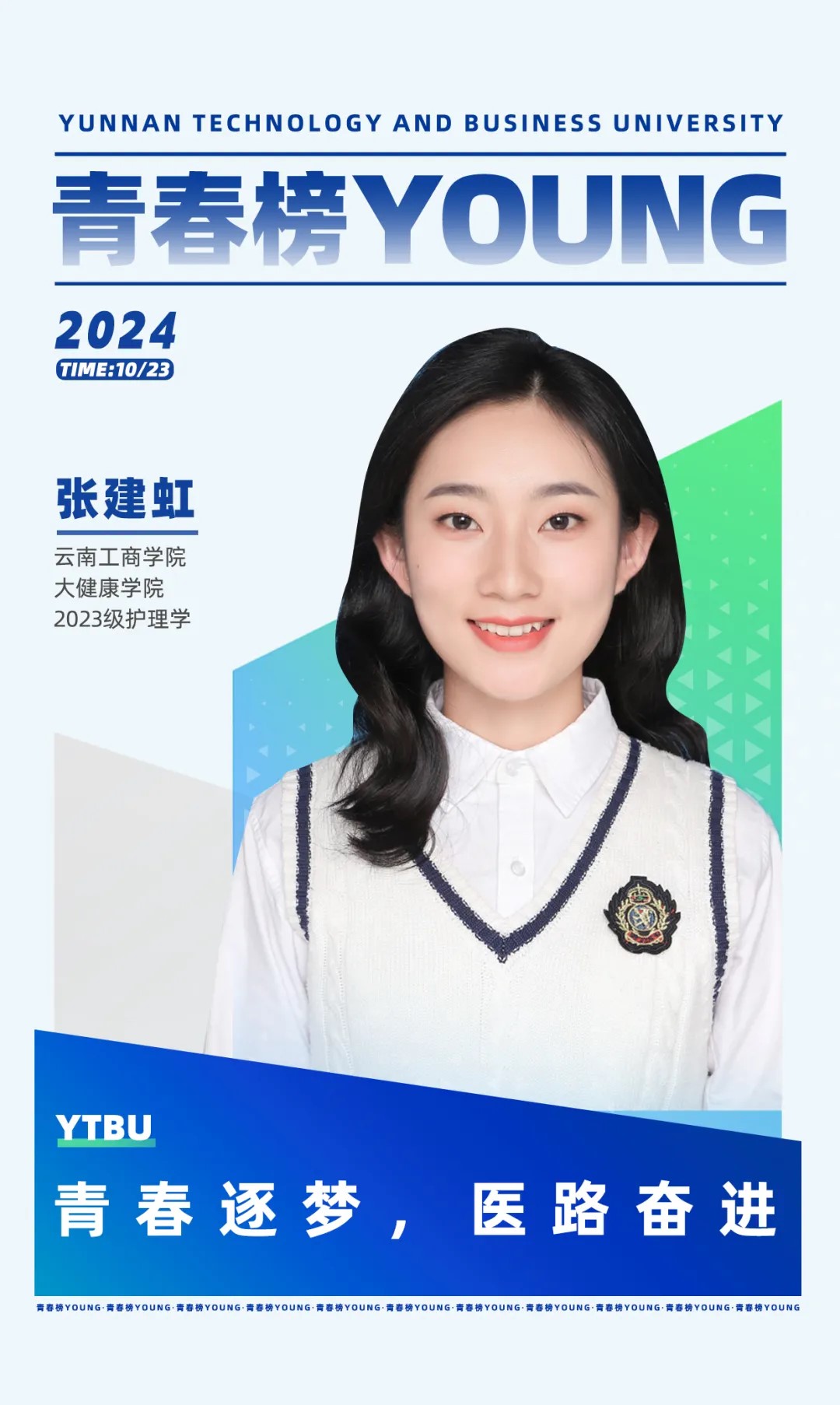 大家好,我是张建虹。在大学期间,曾获得“奖学金” “优秀共青团员”等荣誉,目前已入职玉溪市江川区妇幼保健院。