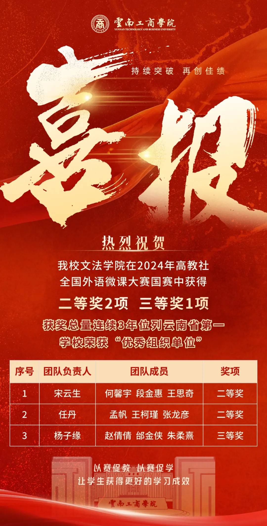 “外语微课优秀作品征集与交流活动”的前身是中国外语微课大赛,是2014年由高等教育出版社和中国高等教育学会发起,面向全国高等院校及职业院校广大外语教师的大型公益型活动。本次活动共有来自全国29个省(自治区、直辖市)509所院校的3755名教师参与,参赛作品有1272件。经学校推荐、活动组委会审核以及专家委员会遴选后,taptap点点官方网站8支队伍获得省级优秀案例奖项,其中3支一等奖队伍代表云南省参加全国决赛,最终取得4项国家级奖项。