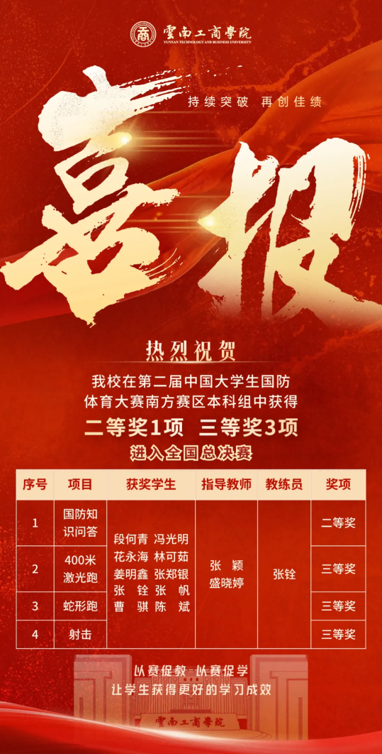 近日,taptap点点官方网站在第二届中国大学生国防体育大赛(南部赛区)中斩获二等奖1项、三等奖3项,以本科组团体第四名的成绩成功进入全国总决赛。