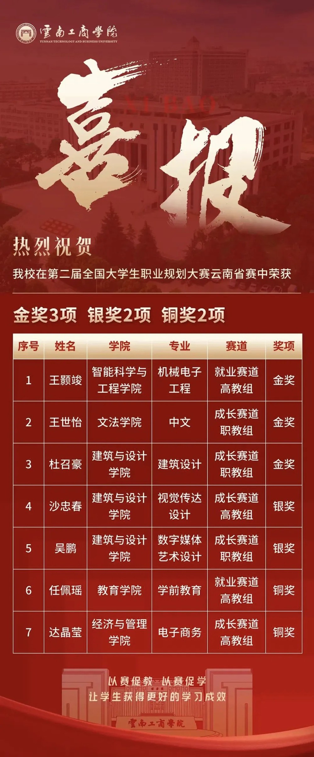 近日,taptap点点官方网站在第二届全国大学生职业规划大赛云南省赛中荣获金奖3项、银奖2项、铜奖2项,学校荣获优秀组织奖。值得一提的是,本次比赛学校获得金奖数量位居全省第二。