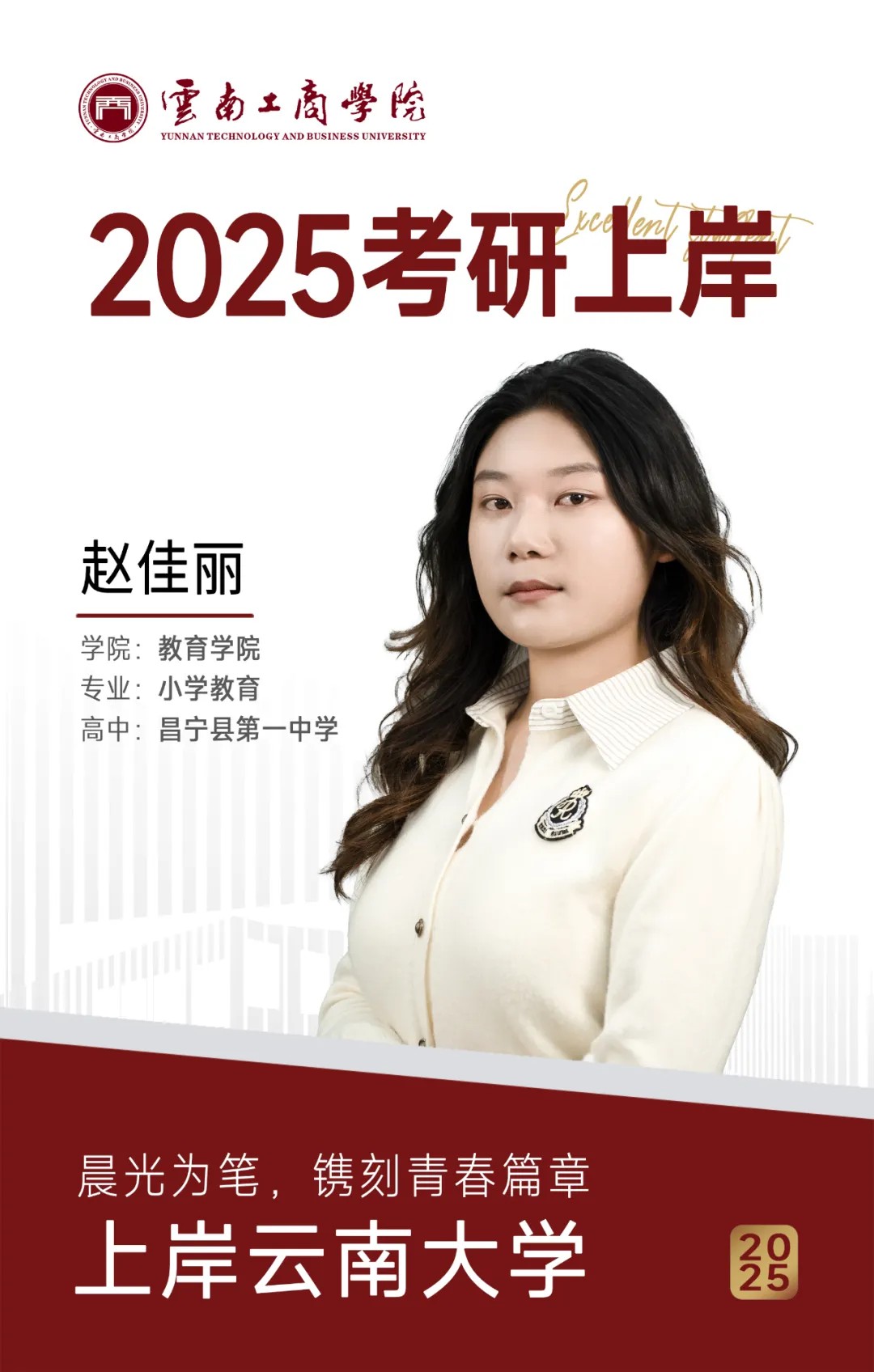 大家好,我是2021级小学教育5班的赵佳丽,高中毕业于昌宁县第一中学,考研顺利上岸云南大学。在校期间获得2023年全国大学生英语竞赛(NECCS)省级优秀奖、优秀实习生、优秀志愿者的荣誉。
