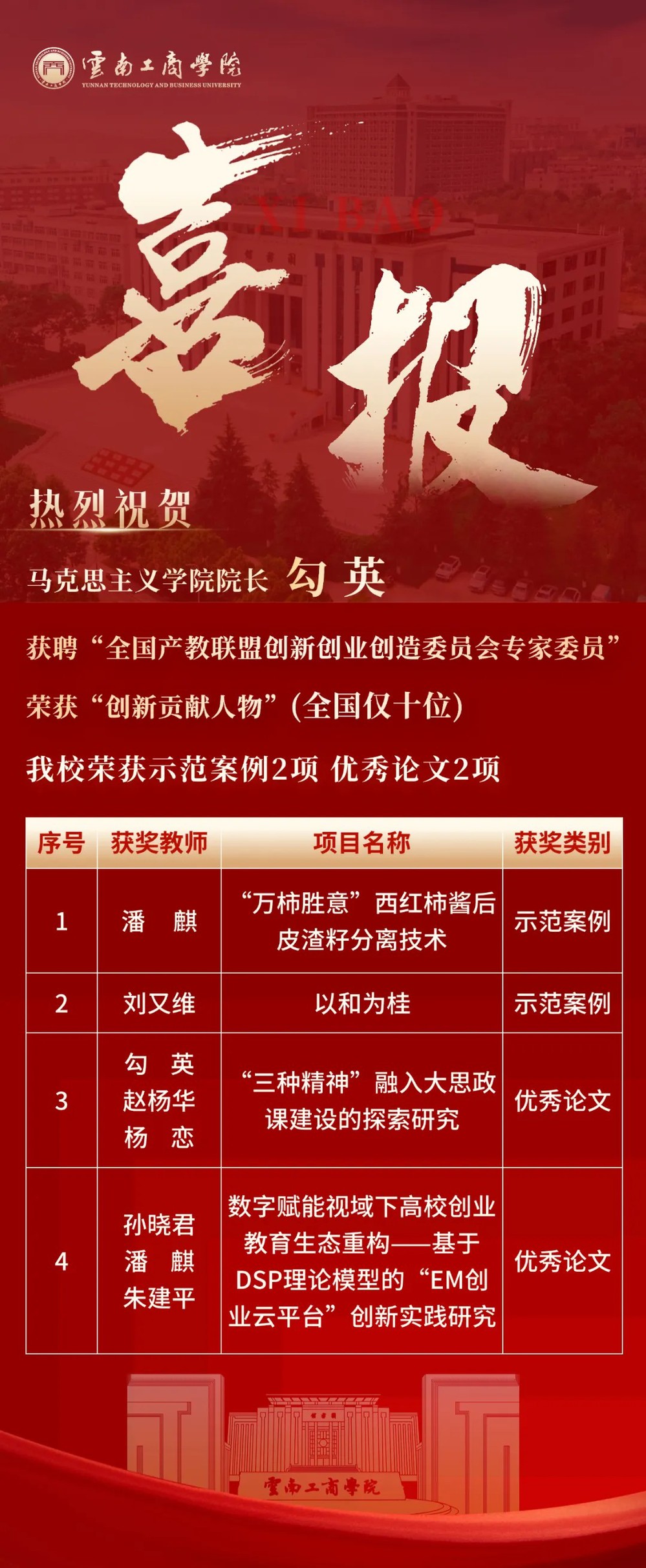 教师潘麒作品《“万柿胜意”西红柿酱后皮渣籽分离技术》荣获示范案例;教师刘又维作品《以和为桂》荣获示范案例;教师勾英、赵杨华、杨恋作品《“三种精神”融入大思政课建设的探索研究》荣获优秀论文;教师孙晓君、潘麒、朱建平作品《数字赋能视域下高校创业教育生态重构——基于DSP理论模型的“EM创业云平台”创新实践研究》荣获优秀论文。