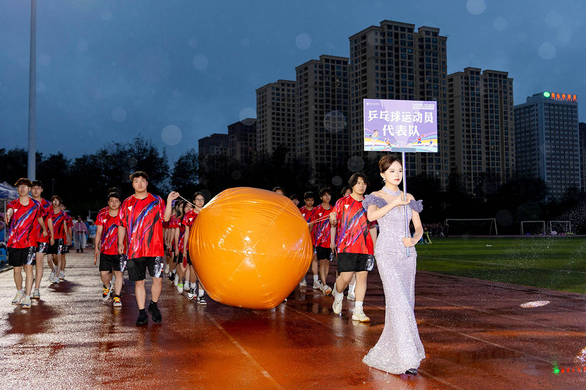 灯光闪耀,欢呼声响。花车缓缓驶入学校,演员舞步翩跹,如诗如画;八支球类方队,昂首阔步,似雄鹰展翅。乒乓球拍舞动白光,羽毛球如流星划过,网球轻跃灵动,排球力拔山河,足球逐风奔跑,篮球掌控节奏……同学们矫健的步伐在运动场上勾勒青春轨迹,以昂扬的姿态书写热血序章!