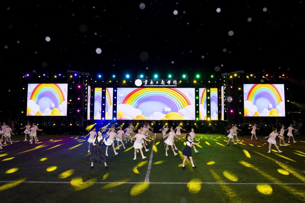 以灯光为画布,身姿为彩墨!跃动似斑斓画卷,旋转如梦幻星河,梦想与色彩交织,让希望与活力共舞,七色光芒映照青春,动人旋律描绘彩虹。