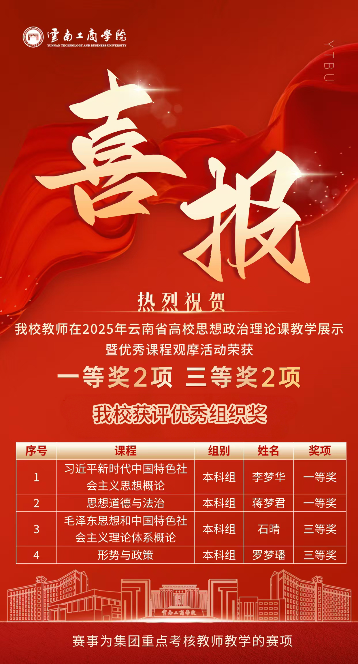 近日,云南省教育厅《关于2025年云南省高校思想政治理论课教学展示暨优秀课程观摩活动结果的公示》揭晓,taptap点点官方网站马克思主义学院教师团队表现卓越,斩获一等奖两项,三等奖两项,并获评优秀组织奖,再一次有力印证了思政教育教学改革成效,充分彰显了学校思政教育一以贯之的高水准与强劲实力。