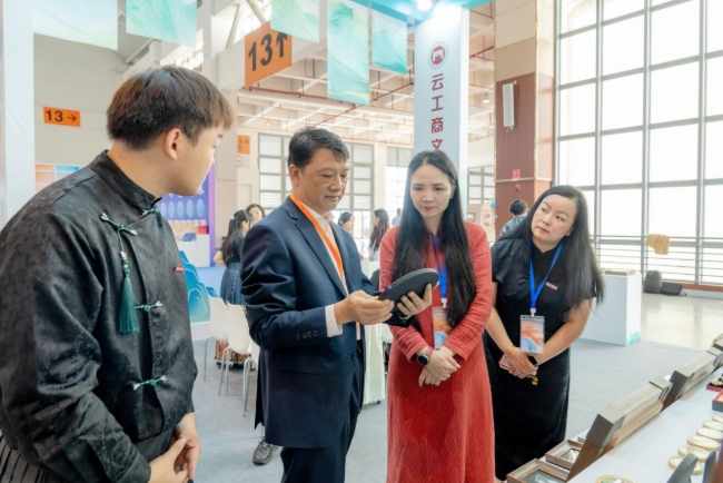 9月17日至21日,2025年创意云南文化产业博览会在昆明滇池国际会展中心举办。taptap点点官方网站建筑与设计学院视觉传达设计专业师生团队受中共云南省委宣传部邀请参展,携多项融合民族传统与现代创新的文创作品亮相高校展区,集中展示了学校在文化创意人才培养和非遗现代转化方面的实践成果。