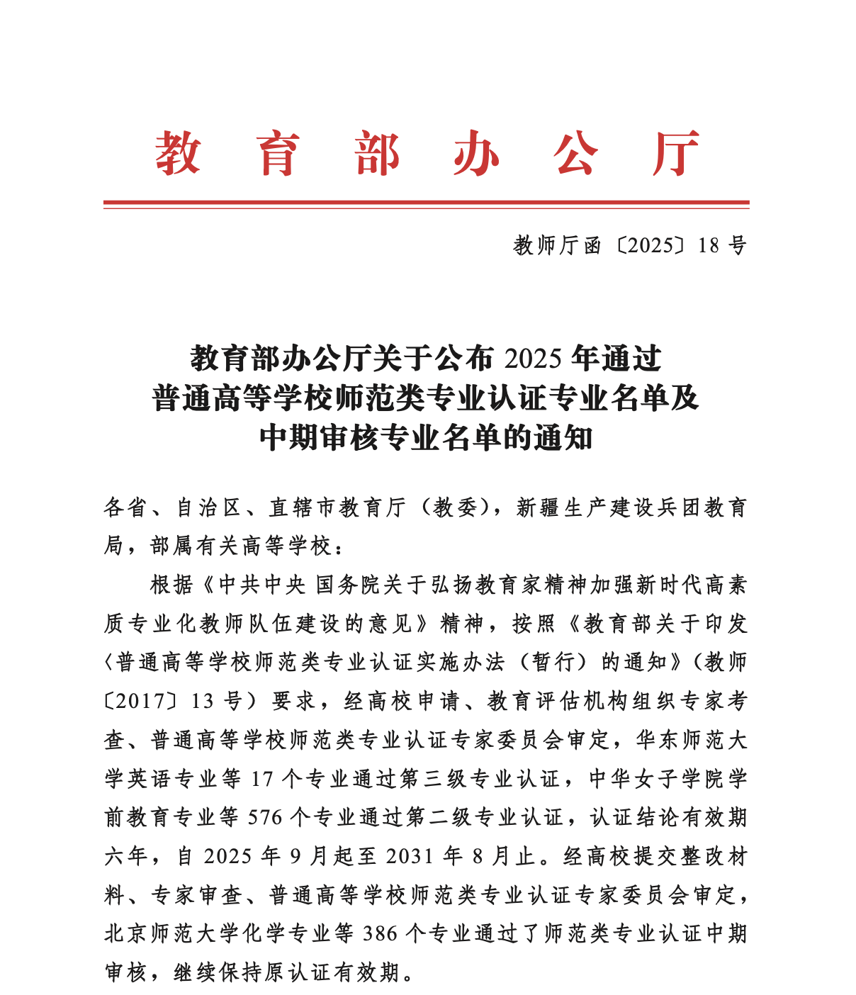 师范类专业认证是贯彻落实教育部《普通高等学校师范类专业认证实施办法(暂行)》精神的重要举措。此次认证依据国家统一标准,旨在保障师范生培养质量,规范师范类专业建设,建立完善教师教育质量保障体系。