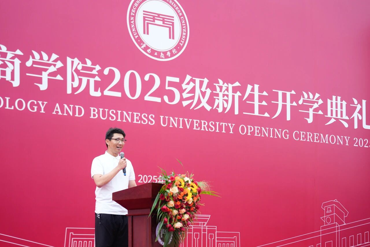 2019级电气自动化专业、现就职于特斯拉上海超级工厂的蔡小明作为优秀校友代表重返母校。他通过回顾自身从云工商学子到国际企业技术骨干的成长轨迹,向全体新生分享了自己的收获和感悟:首先要明确目标,坚定信念;其次要勤奋学习,勇于探索。他建议学弟学妹们珍惜大学时光,认真对待每一门课程,“母校教给我们的每一点知识、每一次训练,都在我们看不见的地方,默默为未来铺路。”