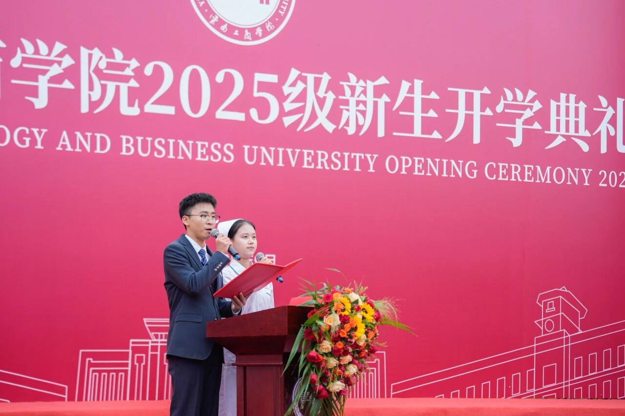 谢浩宇的发言充满青春的激情与力量。他代表全体新生庄严宣告,将在这片新的战场上“向山河请战、向岁月请战、向时代请战、向自己请战”。他誓言,要让图书馆的灯火为青春加冕,让每一次讨论都碰撞出思想的雷鸣,用四年时光锻造出一份名为“中国答案”的硬核成绩单。在谢浩宇的带领下,2025级全体新生举起右手,以青春的名义庄严宣誓:“胸怀祖国,服务人民;挺膺担当,使命在肩!”铿锵誓言在典礼现场回荡,展现了新一代云工商学子昂扬的精神风貌和坚定的报国志向。