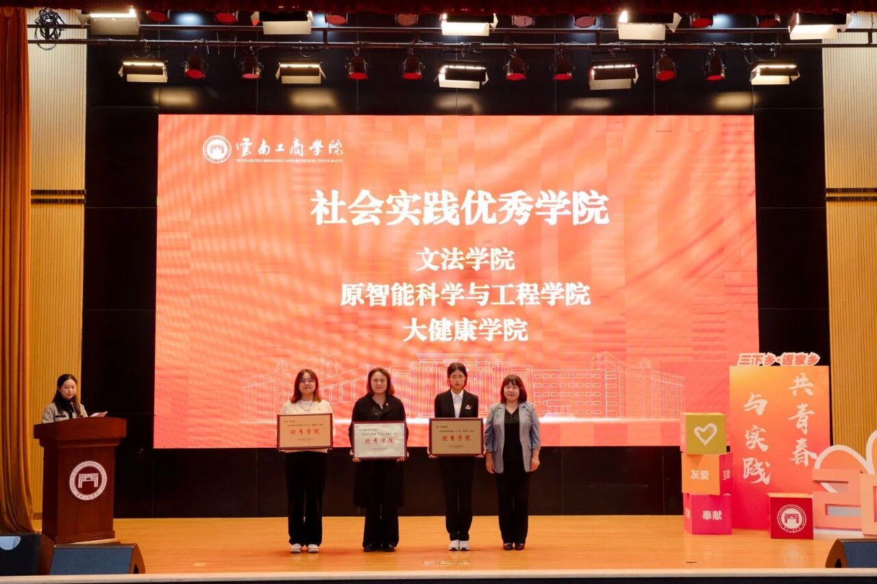 大会在2025年暑期“三下乡”社会实践纪实视频中拉开序幕。视频生动展现了各实践团队深入乡村、扎根一线的奋斗身影:从彝乡田野中的普通话推广课堂,到社区校园里的科创志愿服务;从长江沿岸的生态守护行动,到乡村振兴一线的调研实践。一个个鲜活的画面、一幕幕温暖的瞬间,让现场观众深切感受到云工商学子以行动诠释担当、以实干彰显力量的青春风采。