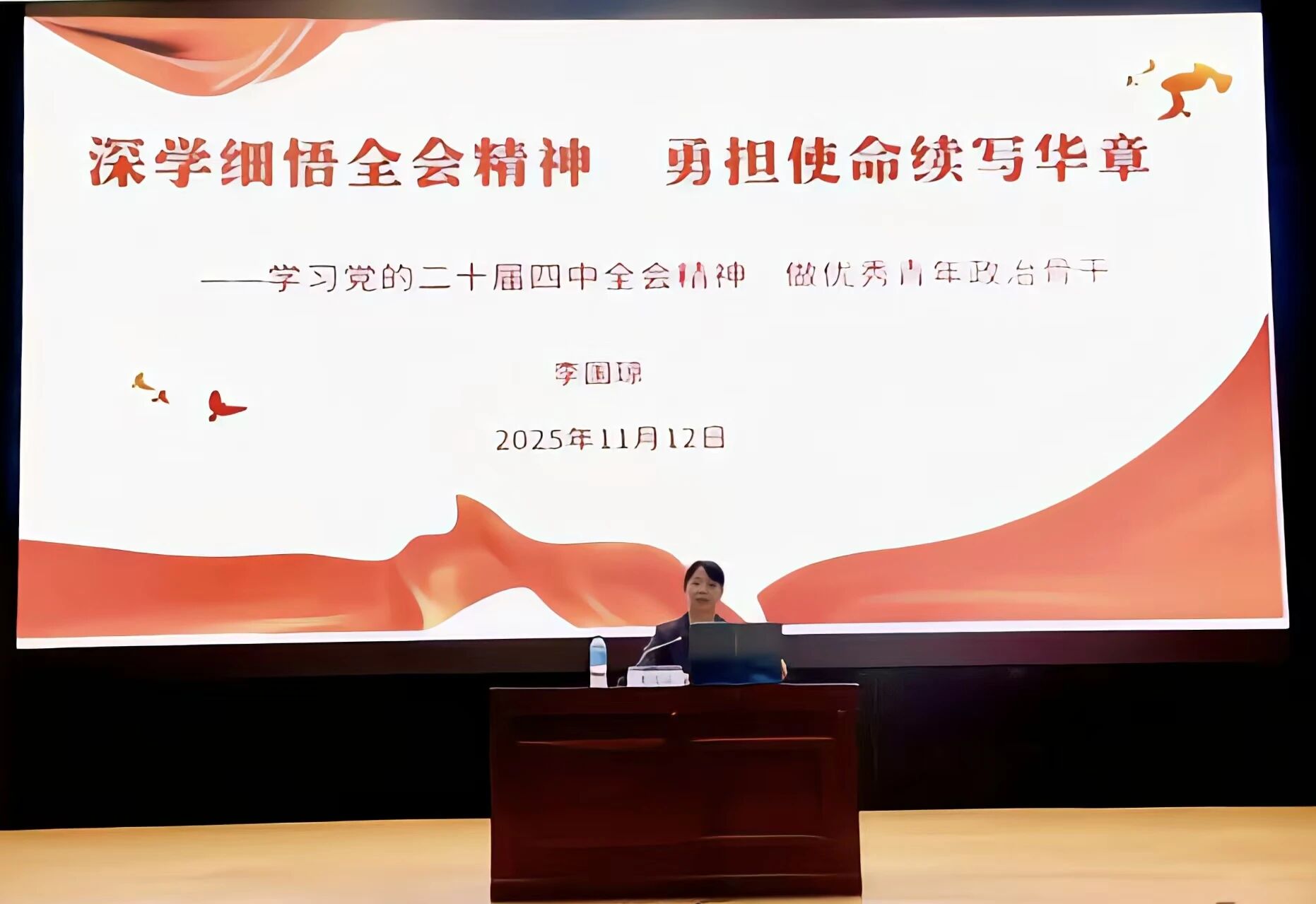 ·11月12日,党委书记李国琼面向团学骨干和“青马工程”学员宣讲党的二十届四中全会精神,激励青年融入国家发展大局。