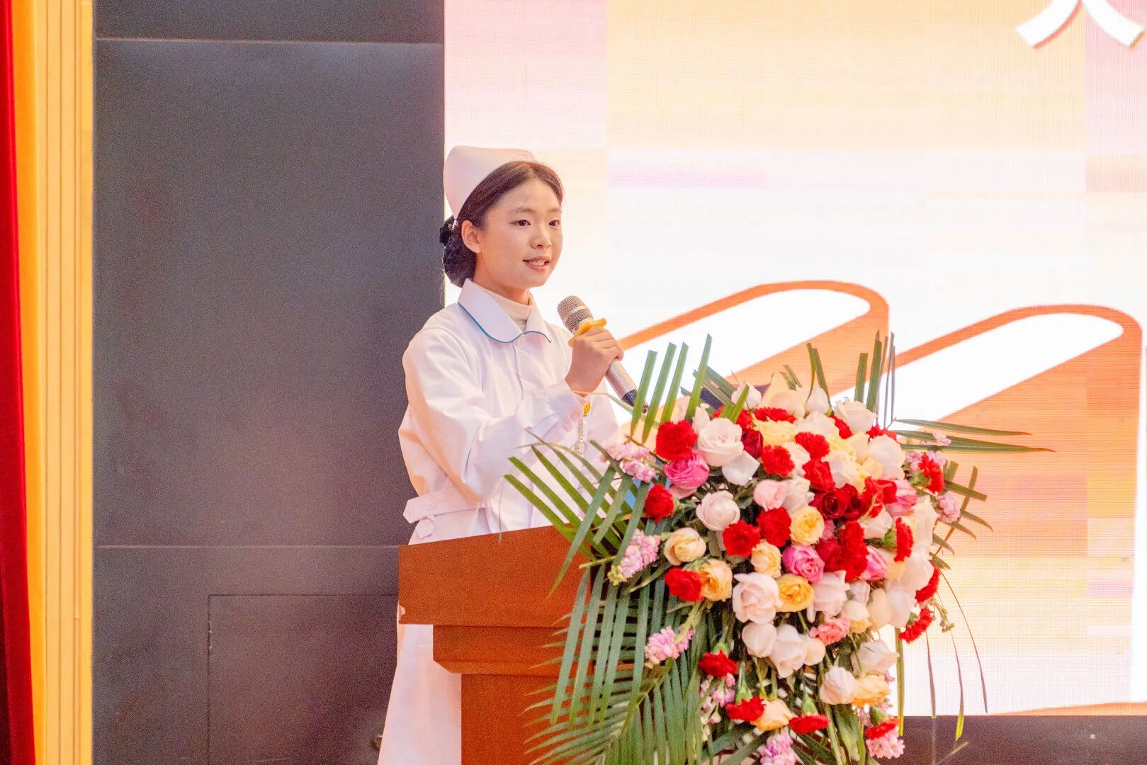 聆听楷模箴言后,2025 级护理专业学生代表刘曦上台发言,承诺将传承南丁格尔精神,以仁爱之心与专业之力,肩负生命重托,不负前辈期许与学校培养。