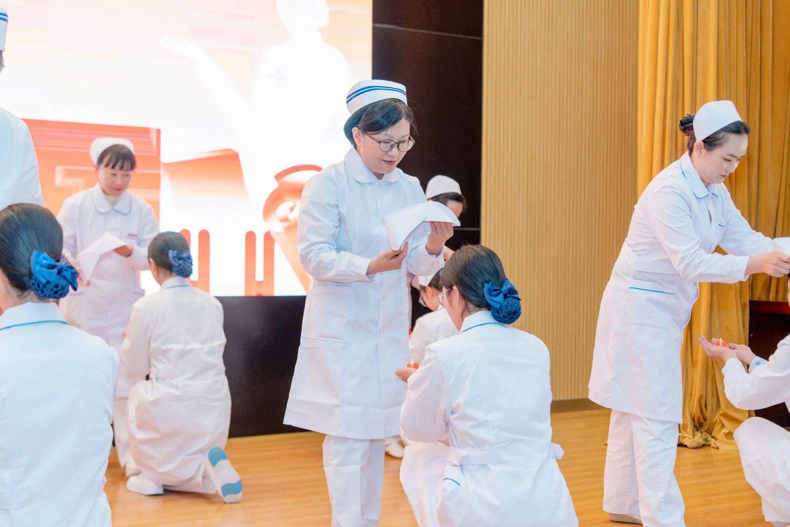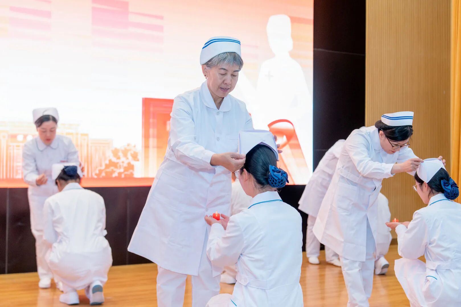 在庄严舒缓的乐曲中,仪式进入核心环节 —— 授帽。王克荣、刘小娟两位南丁格尔奖得主与学院护理教师一同,为 2025 级护理专业学生代表戴上洁白的护士帽。帽檐轻落的瞬间,是新生向 “护理人” 身份的郑重迈步,更是“护佑生命、竭诚奉献、专业精湛、勇气非凡”的南丁格尔精神跨越时代的薪火传递。