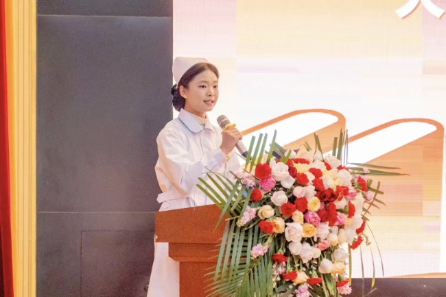 仪式现场,2025级护理专业学生代表刘曦发言,承诺传承南丁格尔精神,以仁心与专业践行护理使命。随后,王克荣、刘小娟与学院教师为学生代表授护士帽,全体新生手捧烛光庄严诵读南丁格尔誓言,完成职业身份的初心宣誓。