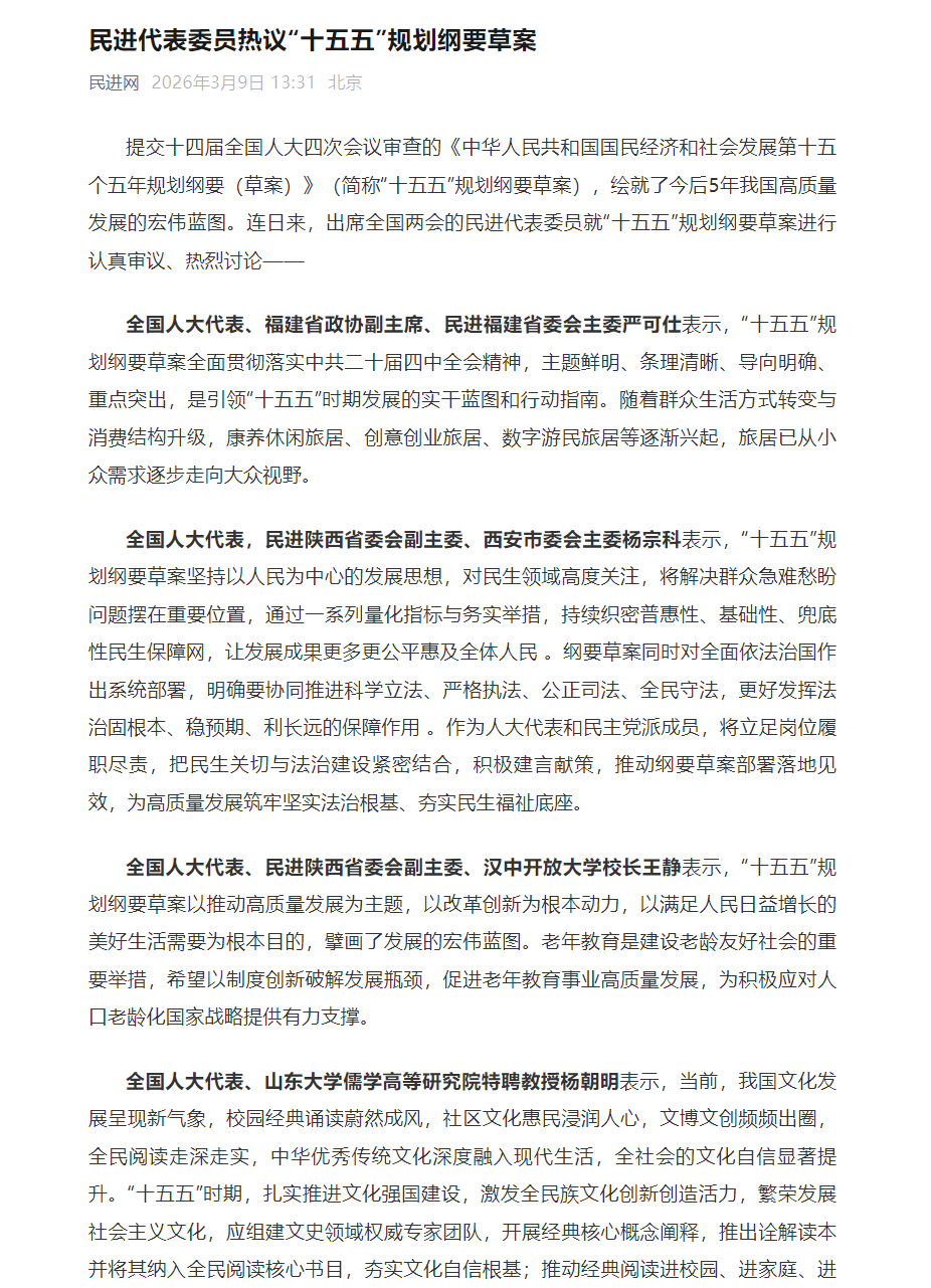 民进网《民进代表委员热议“十五五”规划纲要草案》
