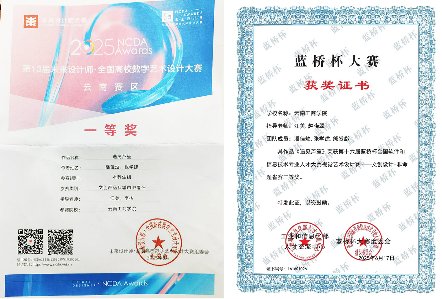 能把基层彩绘做得这么出彩,背后是实打实的专业功底!在校时,张学建就和团队打造文创作品《遇见芦笙》,一举拿下第13届未来设计师·全国高校数字艺术设计大赛(NCDA)云南赛区一等奖、十六届蓝桥杯全国软件和信息技术专业人才大赛视觉艺术设计赛省赛三等奖,将苗族非遗文化与现代创意巧妙融合,专业能力格外扎实。