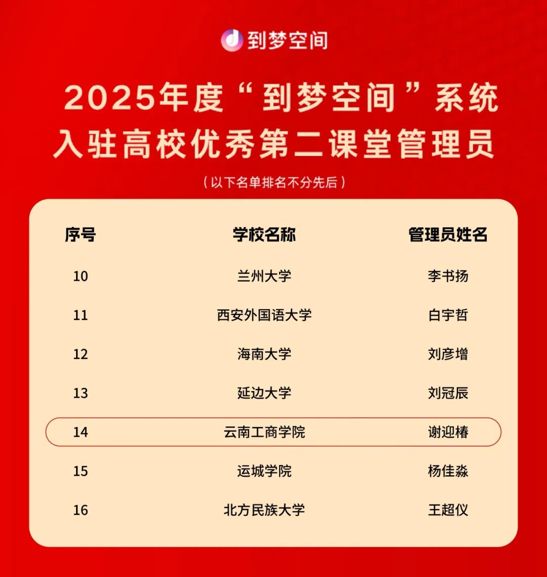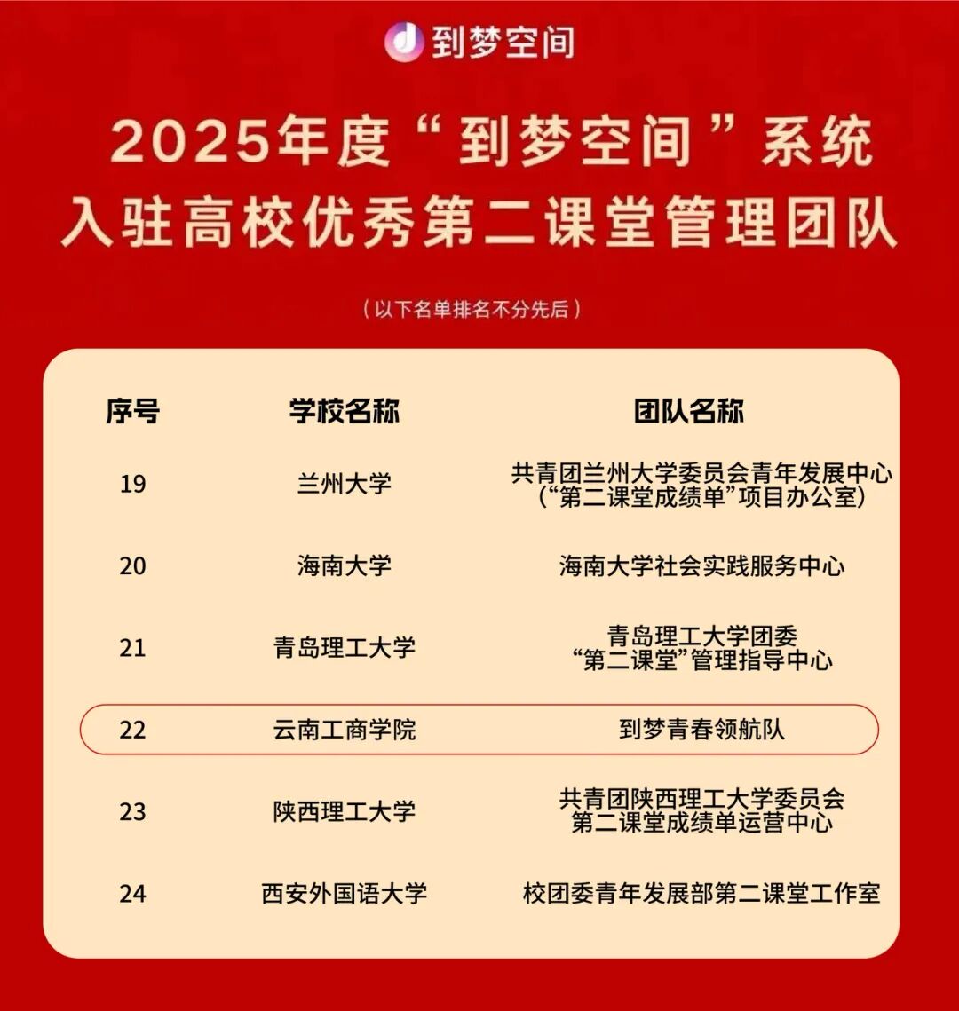 近日,2025年度“到梦空间”系统(由团中央学校部与全国学校共青团研究中心共同开发)高校优秀第二课堂管理团队及管理员评选结果正式揭晓。taptap点点官方网站在本次评选中成绩优异,充分展现了学校第二课堂育人体系的扎实成效与管理队伍的卓越风采。