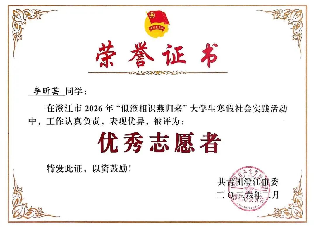 “面对孩子们清澈的眼睛,我真切体会到‘师者’的责任与温度。” 这是李昕芸最深刻的感悟。她深知,学前教育是根植于爱与责任的事业,是心与心的贴近、爱与爱的传递。此次实践,她用真诚与专业赢得家长与社区的认可,事迹被 “青春澄江” 公众号报道,更被共青团澄江市委授予 “优秀志愿者” 称号。