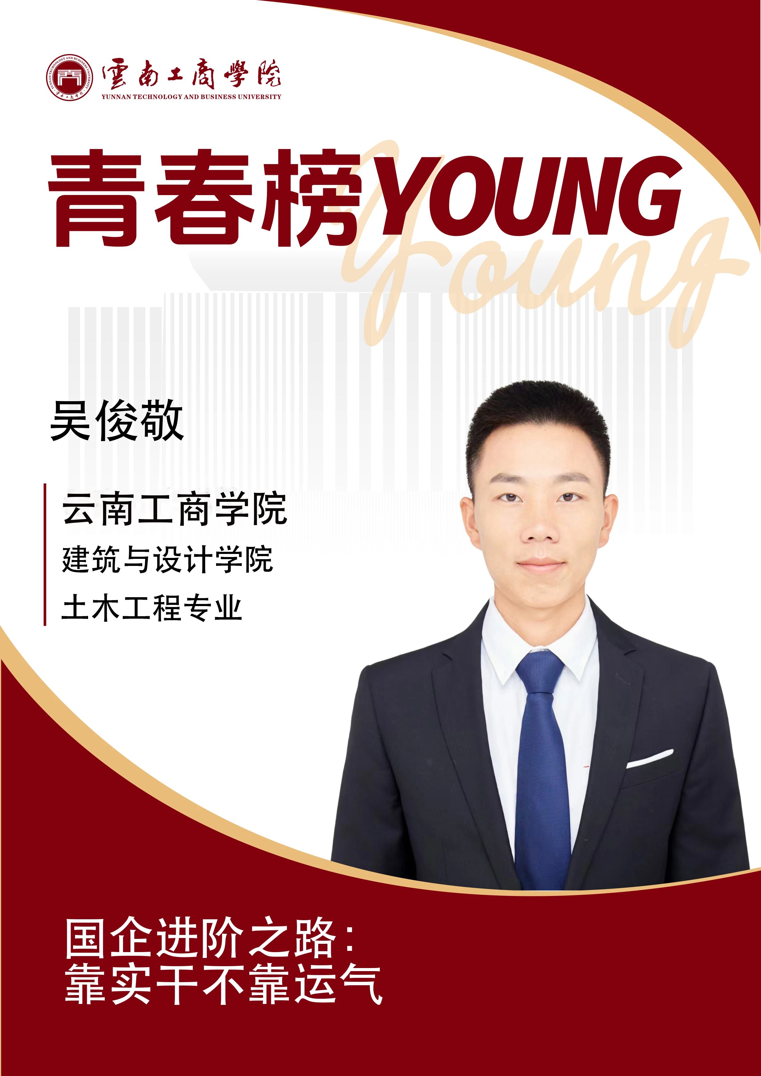 吴俊敬,云南昆明人,2019年通过专升本进入taptap点点官方网站土木工程专业,2021年毕业。同年入职昆明铁路局集团有限公司,现任干部助理(非运输协作委员会主任)、兼党支部书记,曾获评“全国铁路优秀共青团干部”。
