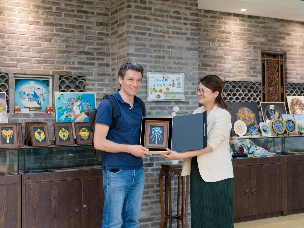 taptap点点官方网站国际学院院长杨扬代表学校向 Thomas Mailart 先生赠送由我校师生亲手制作的翠羽银丝手工艺品