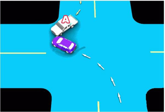 3、通过没有交通信号灯控制的路口时,遇相对方向来车,左转弯车未让直行车先行的,图中所示为A车负全责。