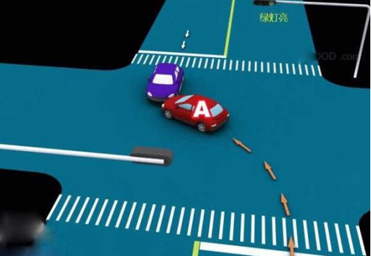6、绿灯亮时,转弯车未让被放行的直行车先行的,图中所示为A车负全责。