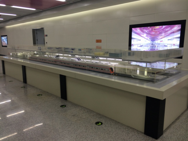 该区域共有7个车站模型,均为换乘车站,由西向东依次排列的6个小模型,主要供运营专业的学生在模型上完成客流流线布置作业,最经典的大模型,它以郭公庄车站为原型,按照1:25比例制作,完整展现了站内环境。通过此模型,不仅运营专业的学生,机电专业和信号专业的学生都可以在这里找到他们想要了解的设备实施。
