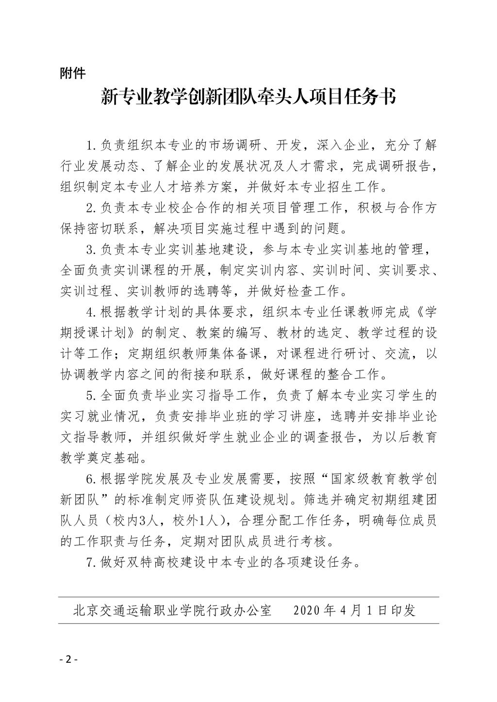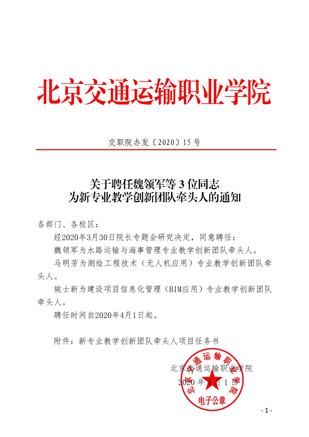 交职院办发〔2020〕15号 关于聘任魏领军等3位同志为新专业教学创新团队牵头人的通知