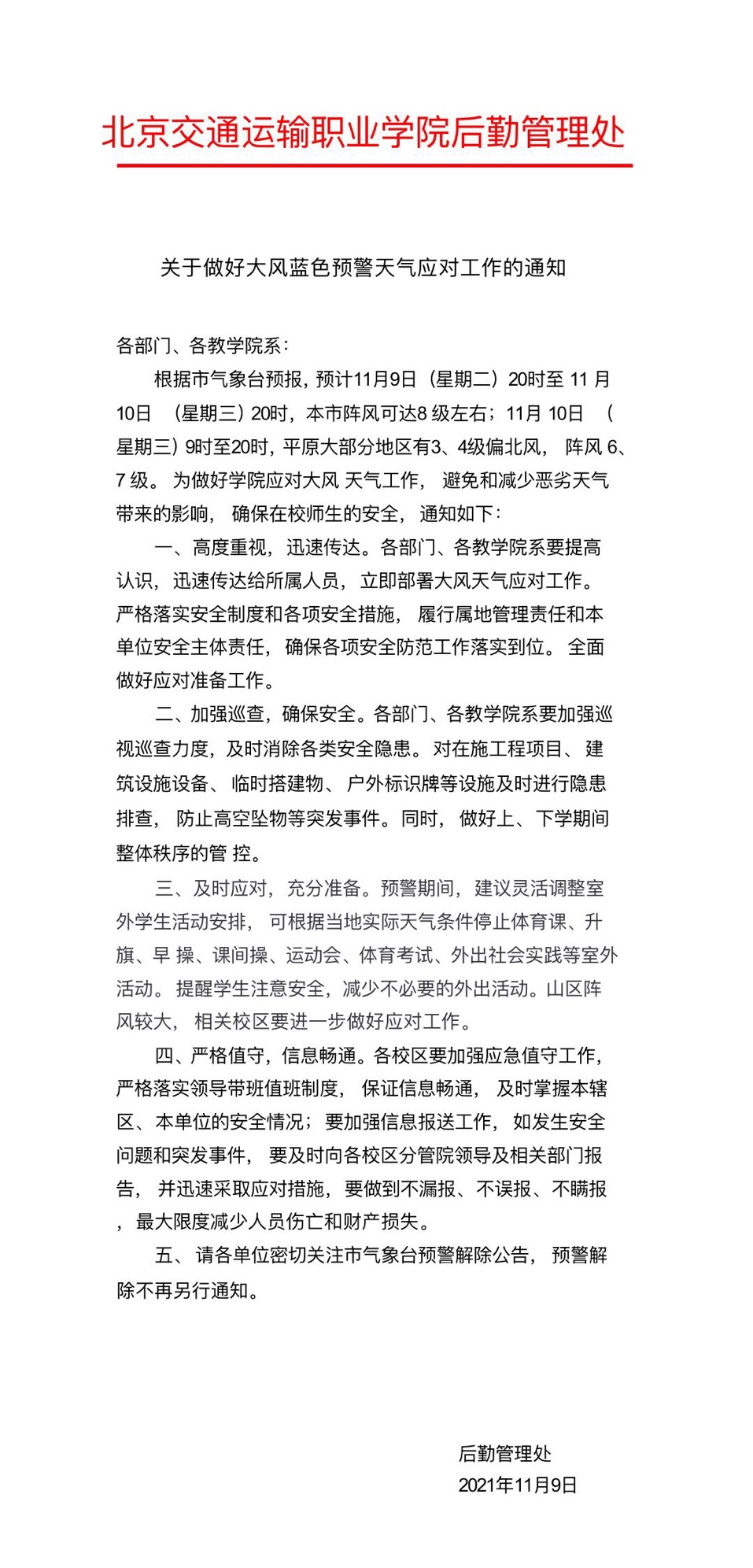 关于做好大风蓝色预警天气应对工作的通知