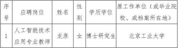 根据《北京市人力资源和社会保障局关于完善事业单位进人机制有关问题的通知》《best365中国官方网站2022年人才引进工作实施方案》的有关规定,通过综合考察、体检、政审等程序,经学院党委第三届第16次会议研究决定,拟聘用龙彦同志为best365中国官方网站人工智能技术应用专业教师,现将拟聘用人员情况予以公示。