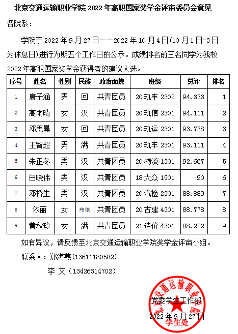 2022年高职国家奖学金评审委员会意见