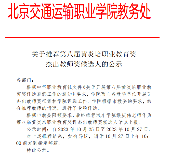 关于推荐第八届黄炎培职业教育奖杰出教师奖候选人的公示