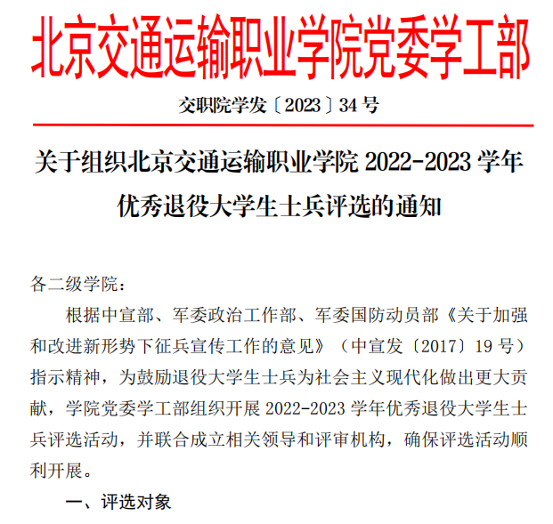 关于组织学院2022-2023学年优秀退役大学生士兵评选的通知