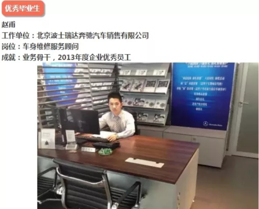 毕业生成为汽车后市场专业技术人员和销售及售后服务人员的精英团队,遍布北京中高端汽车品牌经销店,在汽车诊断与检测、汽车销售与服务管理、汽车钣金与喷漆、汽车配件管理、汽车定损与评估领域发挥了骨干作用。