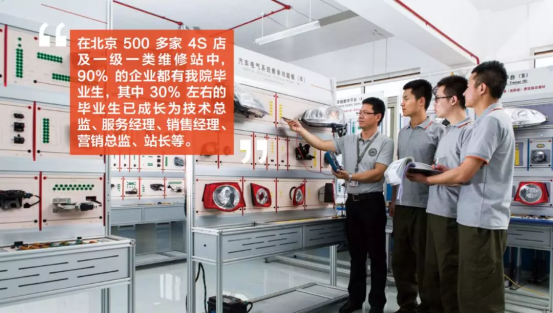 在北京500多家4S店及一级一类维修站中,90%的企业都有我院毕业生。其中30%左右的毕业生已成长为技术总监、服务经理、销售经理、营销总监、站长等。