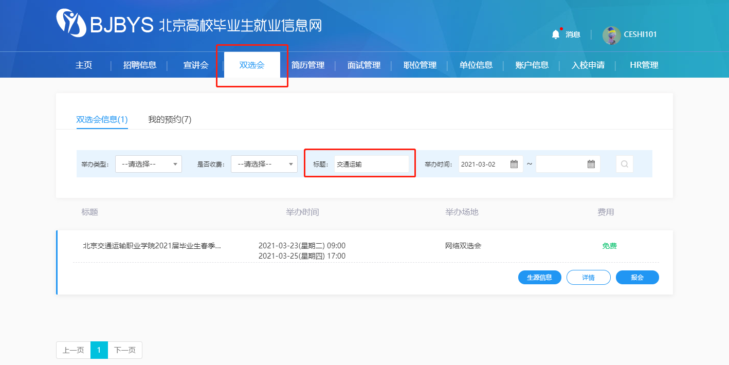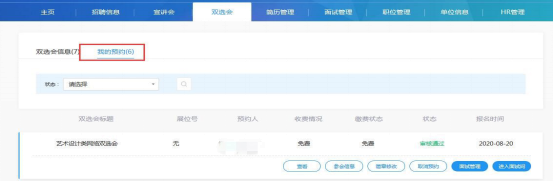 报名双选会后请等待审核,一般情况下最晚会在双选会前1周完成大多数参会单位的审核工作,审核结果可以通过系统“双选会”栏目“我的预约”按钮进行查看。
