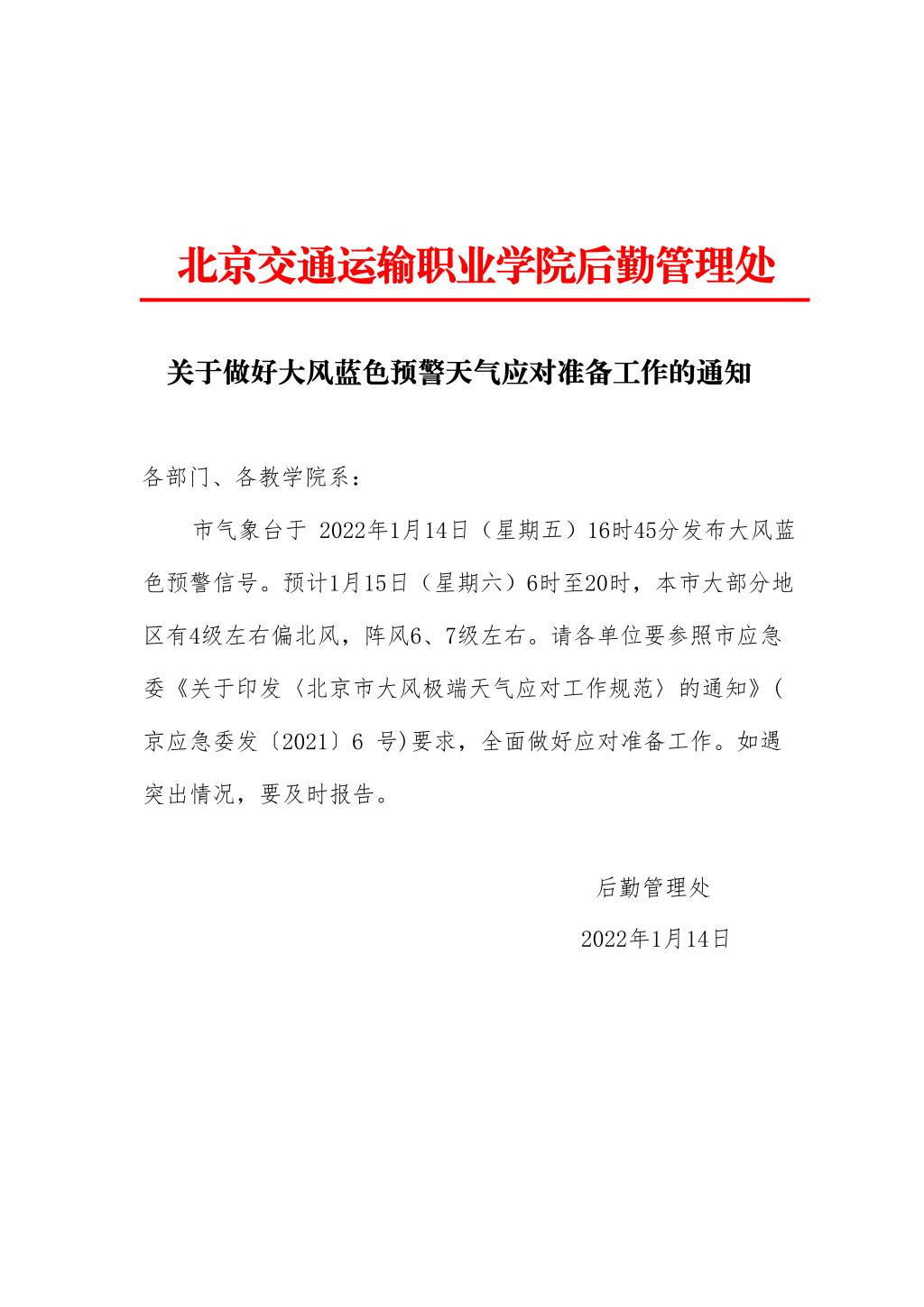 关于做好大风蓝色预警天气应对准备工作的通知20220114