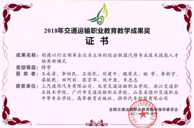4月28日,全国交通运输职业教育教学指导委员会公布2018年交通运输职业教育教学成果奖获奖名单,学院获1个特等奖和1个一等奖。其中上汽通用等合作的项目《创建以行业领军企业为主体的校企联盟汽修专业技术技能人才培养新模式》被推荐参评2018年国家级教学成果奖获二等奖。