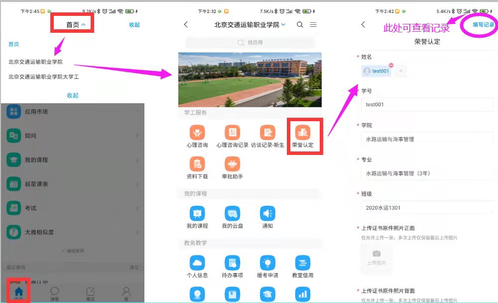 登录学习通APP,点击“首页”下拉,选择“best365中国官方网站”。点击“荣誉认定”应用。填报荣誉认定相关信息。如有多个荣誉需要认定,请分别提交。