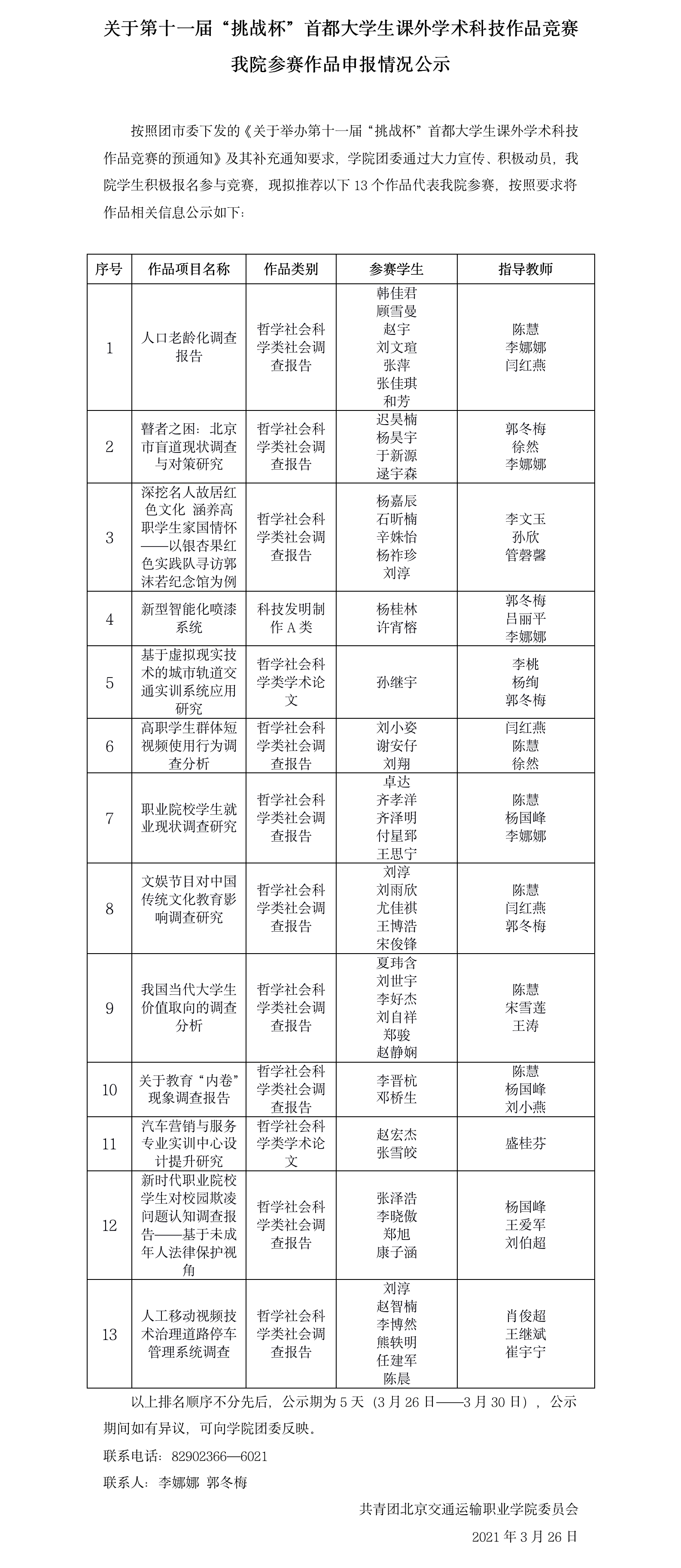 【团委】关于第十一届“挑战杯”首都大学生课外学术科技作品竞赛我院参赛作品申报情况公示